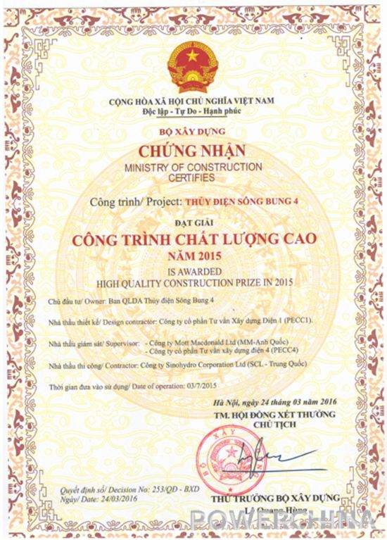 2016年3月,公司承建的松邦4水電站榮獲越南國(guó)家優(yōu)質(zhì)工程大獎(jiǎng)。