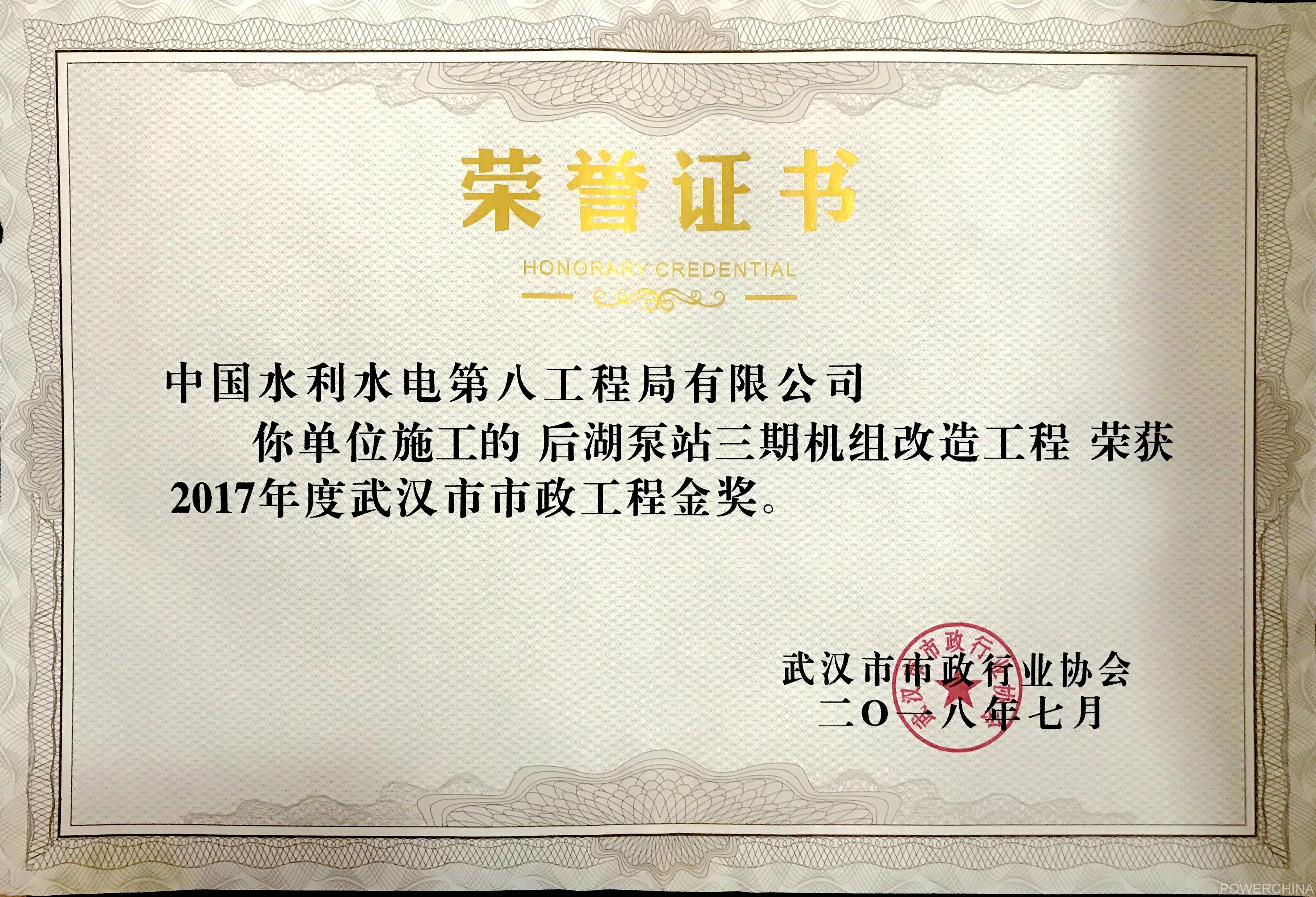 榮獲武漢市后湖泵站三期榮獲武漢市市政工程金獎