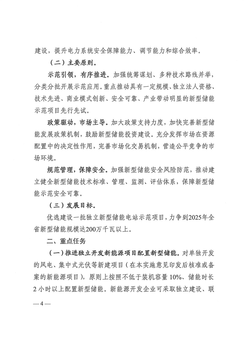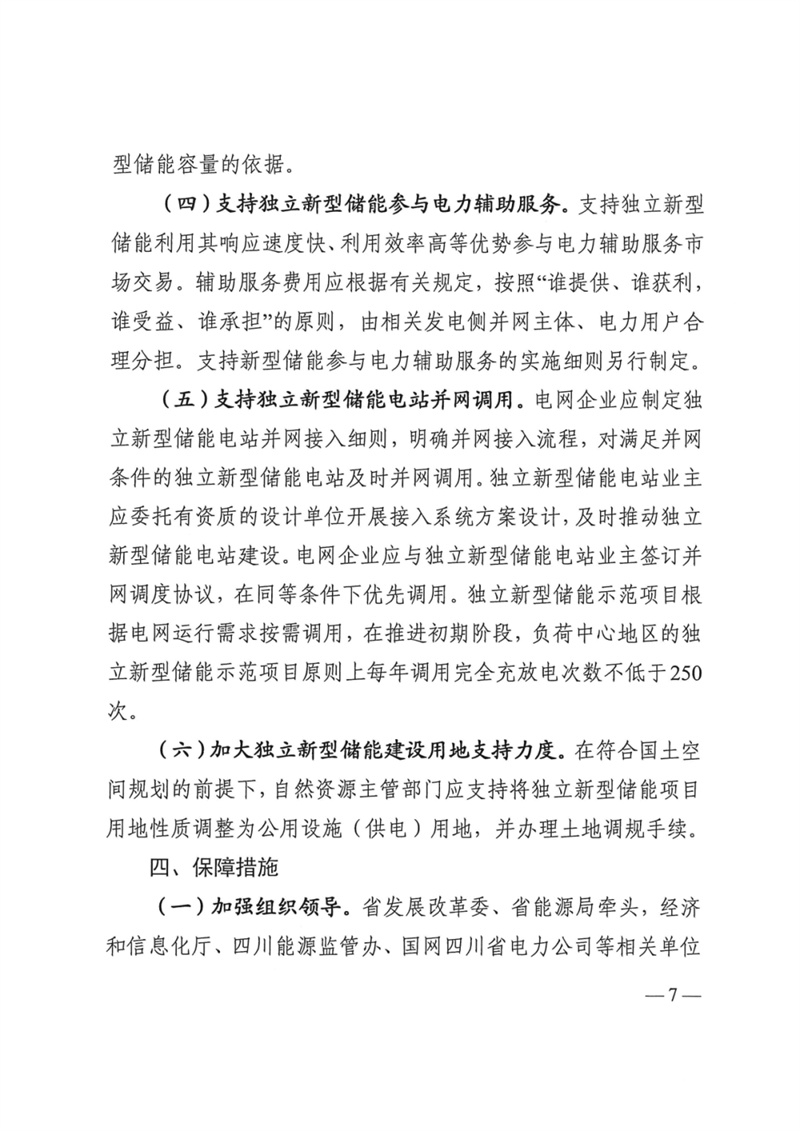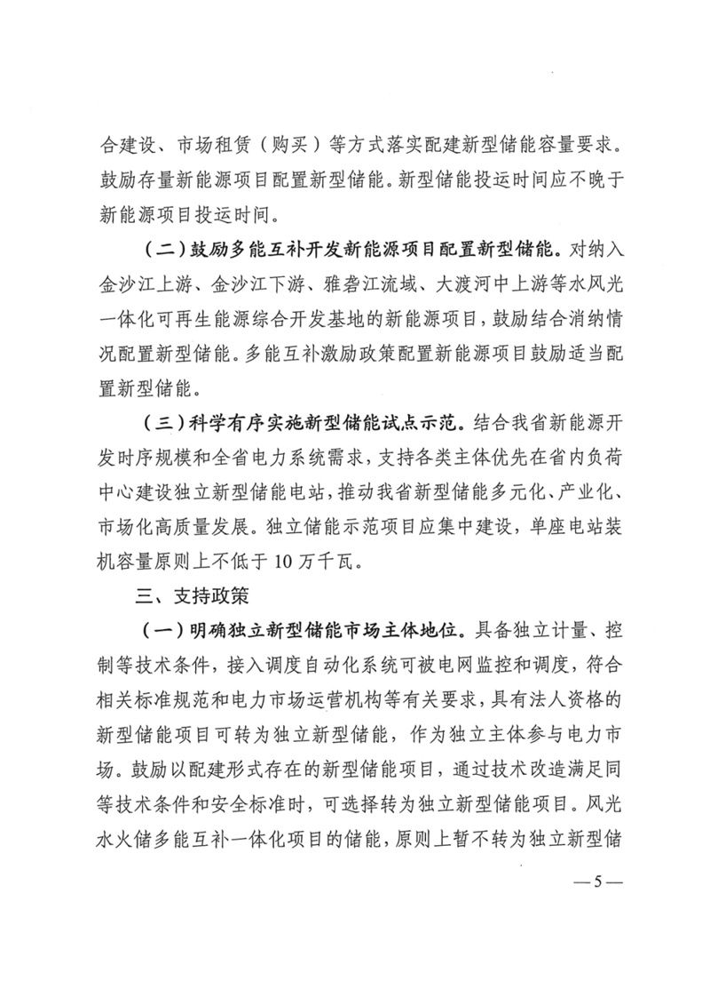 9月11日,四川省發(fā)改委、四川省能源局、四川省經(jīng)濟(jì)和信息化廳、國(guó)家能源局四川監(jiān)管辦公室聯(lián)合印發(fā)了《關(guān)于加快推動(dòng)四川省新型儲(chǔ)能示范項(xiàng)目建設(shè)的實(shí)施意見(jiàn)》(以下簡(jiǎn)稱(chēng)《實(shí)施意見(jiàn)》),有效期5年。《實(shí)施意見(jiàn)》提出,優(yōu)選建設(shè)一批獨(dú)立新型儲(chǔ)能電站示范項(xiàng)目,力爭(zhēng)到2025年全省新型儲(chǔ)能規(guī)模達(dá)200萬(wàn)千瓦以上。 重點(diǎn)任務(wù): 1.推進(jìn)獨(dú)立開(kāi)發(fā)新能源項(xiàng)目配置新型儲(chǔ)能。要求為不低于裝機(jī)容量10%,時(shí)長(zhǎng)2小時(shí)以上。 2.鼓勵(lì)多能互補(bǔ)開(kāi)發(fā)新能源項(xiàng)目配置新型儲(chǔ)能。對(duì)納入金沙江上游、金沙江下游、雅礱江流域、大渡河中上游等水風(fēng)光一體化可再生能源綜合開(kāi)發(fā)基地的新能源項(xiàng)目,鼓勵(lì)結(jié)合消納情況配置新型儲(chǔ)能。 3.有序推進(jìn)儲(chǔ)能試點(diǎn)示范。支持各類(lèi)主體優(yōu)先再省內(nèi)負(fù)荷中心建設(shè)獨(dú)立新型儲(chǔ)能電站,推動(dòng)新型儲(chǔ)能多元化/產(chǎn)業(yè)化/市場(chǎng)化發(fā)展。獨(dú)立儲(chǔ)能示范項(xiàng)目應(yīng)集中建設(shè),單座電站裝機(jī)容量原則上不低于10萬(wàn)千瓦。 支持政策: 1.明確獨(dú)立新型儲(chǔ)能市場(chǎng)主體地位。符合條件和標(biāo)準(zhǔn)的,具有法人資格的新型儲(chǔ)能項(xiàng)目可轉(zhuǎn)為獨(dú)立新型儲(chǔ)能,作為獨(dú)立主體參與電力市場(chǎng)。鼓勵(lì)以配建形式存在的新型儲(chǔ)能項(xiàng)目,可選擇轉(zhuǎn)為獨(dú)立新型儲(chǔ)能項(xiàng)目。風(fēng)光水火儲(chǔ)多能互補(bǔ)一體化項(xiàng)目的儲(chǔ)能,原則上暫不轉(zhuǎn)為獨(dú)立新型儲(chǔ)能。 2.支持獨(dú)立新型儲(chǔ)能參與市場(chǎng)交易。進(jìn)入電力現(xiàn)貨市場(chǎng)前,儲(chǔ)能電站作為獨(dú)立市場(chǎng)主體參與市場(chǎng)中長(zhǎng)期交易。充電時(shí),可作為電力市場(chǎng)用戶(hù)享受分時(shí)電價(jià)政策;放電時(shí),參加火電市場(chǎng)化交易,價(jià)格由市場(chǎng)形成。 獨(dú)立新型儲(chǔ)能電站向電網(wǎng)送電的,其相應(yīng)充電電量不承擔(dān)輸配電價(jià)和政府性基金及附加,充放電損耗電費(fèi)由獨(dú)立新型儲(chǔ)能電站承擔(dān)。 進(jìn)入電力現(xiàn)貨市場(chǎng)后,獨(dú)立新型儲(chǔ)能電站用電電價(jià)、上網(wǎng)電價(jià)按照現(xiàn)貨市場(chǎng)價(jià)格及規(guī)則結(jié)算。 3.建立獨(dú)立新型儲(chǔ)能容量共享租賃機(jī)制。建議參考區(qū)間為200-400元/千瓦年。鼓勵(lì)新能源開(kāi)發(fā)企業(yè)和獨(dú)立儲(chǔ)能新型儲(chǔ)能項(xiàng)目業(yè)主單位簽訂長(zhǎng)期租賃協(xié)議合同。 4.支持獨(dú)立新型儲(chǔ)能參與電力輔助服務(wù)。 5.支持獨(dú)立新型儲(chǔ)能電站并網(wǎng)調(diào)用。電網(wǎng)企業(yè)應(yīng)與獨(dú)立新型儲(chǔ)能電站業(yè)主簽訂并網(wǎng)調(diào)度協(xié)議,同等條件下優(yōu)先調(diào)用。原則上每年調(diào)用完全充放電次數(shù)不低于250次。 原文如下: | ||||